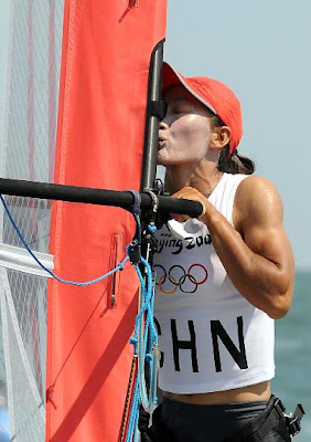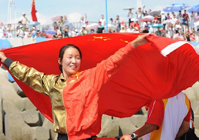 She won the gold medal in the 帆板尼尔级比赛 event. A first for China. And she wore our split jacket. How nice. 🙂